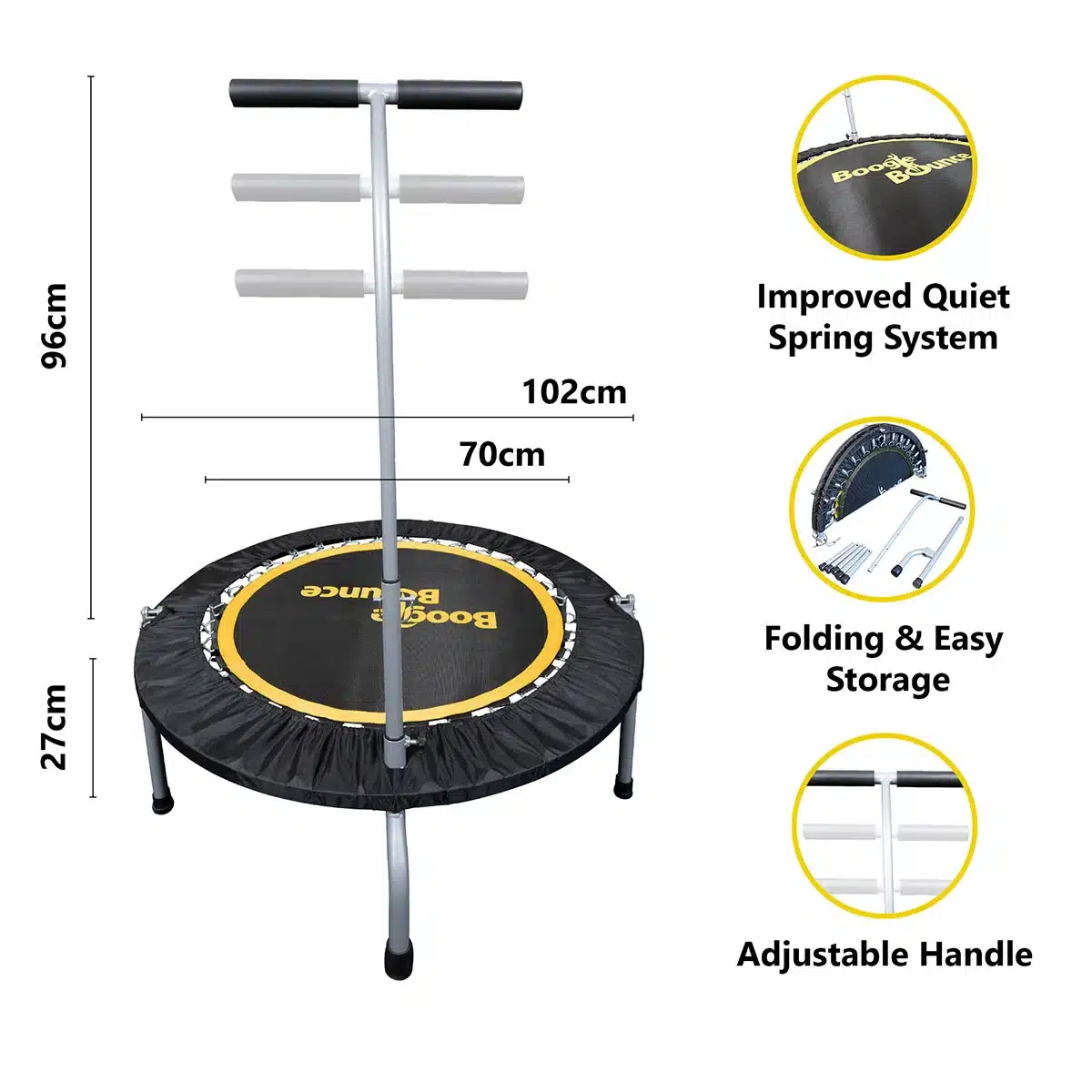 - The patented T-Bar handle and ultra-quiet design make Boogie Bounce trampolines stand out from competitors in the rebounding fitness market.
