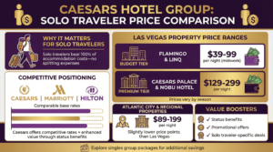 While Caesars doesn’t explicitly offer “solo traveler rates,” their pricing structure inherently benefits individual travelers through personalized offers based on your play and stay history. Solo travelers receive targeted email and app promotions reflecting their individual value to Caesars rather than household value, often resulting in more frequent complimentary or deeply discounted room offers than couples or families receive. Diamond tier members especially benefit from single-occupancy upgrade availability, as properties prioritize suite upgrades for solo elite guests when managing limited inventory. For more on solo travel, check out these solo travel adventure destinations.